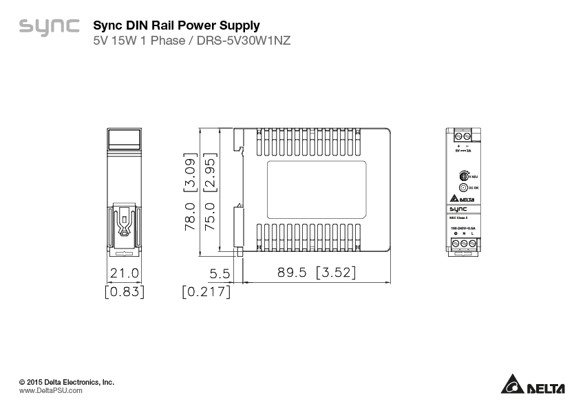 Надкомпактне та конкурентоспроможне за ціною джерело живлення Delta Sync DRS-5V30W1NZ на DIN-рейку розроблене для промислових застосувань, що вимагають високонадійних джерел живлення, які мають бути розміщені в невеликому просторі. Серія Sync працює з універсальним вхідним діапазоном змінного струму та забезпечує повну потужність при температурі до 55 °C. Вихід регулюється в межах 5,0-5,5 вольт і може підтримувати ємність навантаження до 3000 мкФ. Зелений світлодіод свідчить про наявність виходу. Всі моделі цієї серії сертифіковані відповідно до IEC/EN/UL 60950 1, IEC/EN/UL 623681 Information Technology Equipment (ITE) та UL 508 Industrial Control Equipment (ICE). Серія також повністю відповідає вимогам директиви RoHS 2011/65/EU щодо захисту навколишнього середовища. Для цього продукту доступні сертифікати NEC Class 2 та Limited Power Source (LPS).
