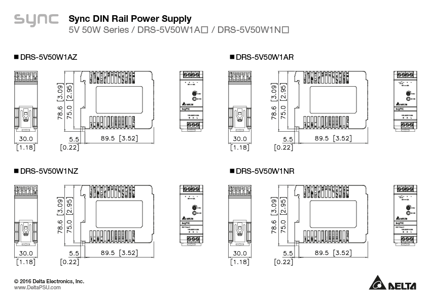 Надкомпактне та конкурентоспроможне за ціною джерело живлення Delta Sync DRS-5V50W1☐☐ на DIN-рейку розроблене для промислових застосувань, що вимагають високонадійних джерел живлення, які мають бути розміщені в невеликому просторі. Серія Sync працює з універсальним вхідним діапазоном змінного струму та забезпечує повну потужність при температурі до 55 °C. Регульований вихід в діапазоні 5 - 55 вольт може підтримувати ємність навантаження до 3000 мікрофарад. Зелений світлодіод свідчить про наявність виходу. Всі моделі цієї серії сертифіковані відповідно до IEC/EN/UL 60950 1, IEC/EN/UL 623681 Information Technology Equipment (ITE) та UL 508 Industrial Control Equipment (ICE). Серія також повністю відповідає вимогам директиви RoHS 2011/65/EU щодо захисту навколишнього середовища. Сертифікати NEC Class 2 та Limited Power Source (LPS) доступні для DRS-5V50W1N.