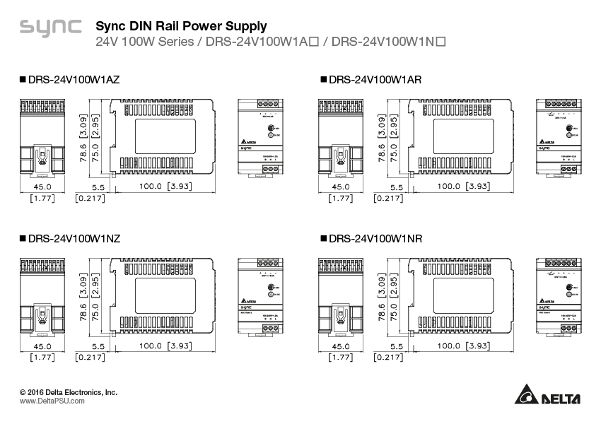 Надкомпактне та конкурентоспроможне за ціною джерело живлення Delta Sync DRS-24V100W1☐☐ на DIN-рейку розроблене для промислових застосувань, що вимагають високонадійних джерел живлення, які мають бути розміщені в невеликому просторі. Серія Sync працює з універсальним вхідним діапазоном змінного струму та забезпечує повну потужність при температурі до 55 °C. Регульований вихід у діапазоні 24 - 28 вольт для DRS-24V100W1A☐ та 22-24 вольт для DRS-24V100W1N☐, може підтримувати ємність навантаження до 3000 мікрофарад. Зелений світлодіод свідчить про наявність виходу. Конструкція сертифікована відповідно до IEC/EN/UL 60950 1, IEC/EN/UL 623681 Information Technology Equipment (ITE) та UL 508 Industrial Control Equipment (ICE). Серія також повністю відповідає вимогам директиви RoHS 2011/65/EU щодо захисту навколишнього середовища. Для цього продукту доступні сертифікати NEC Class 2 та Limited Power Source (LPS).